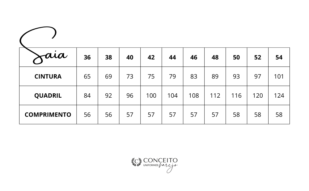 Saia tradicional modelo social, cós de 5cm reto, zíper e recorte traseiro padrão.